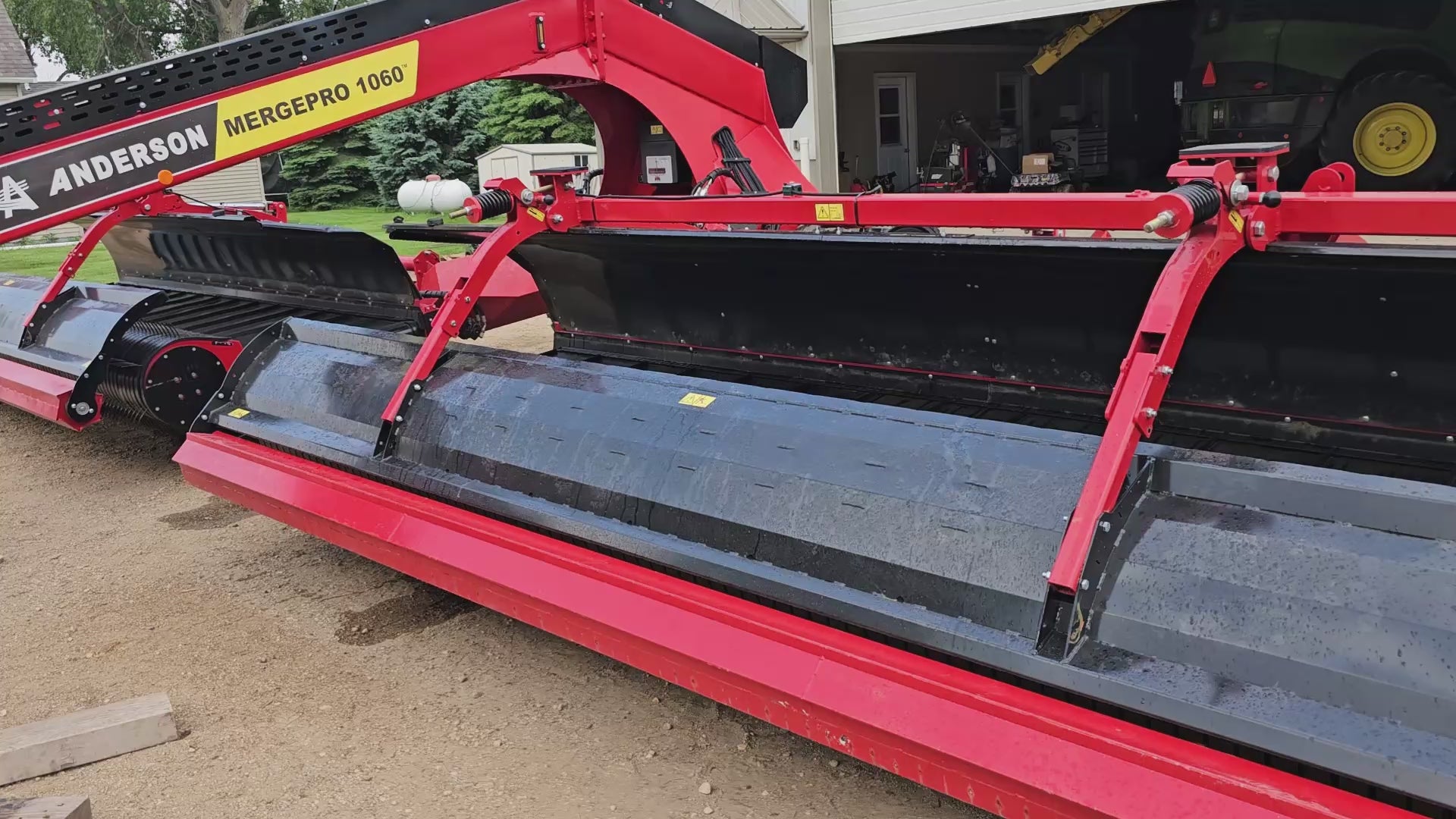 The Anderson MergePro 1060 35′ Field Merger uses a camless 6-row pickup reel that improves field speed and reduces maintenance overall. It can run in center delivery mode at a 35′ width or side delivery at a 30′ plus an extra swath. The 1060 is built to maintain a smooth, even flow with its Adaptive True Ground Speed system, which adjusts pickup and belt speed based on travel speed to give you a more consistent crop handling and less crop damage. It requires a minimum of ~100 HP on flat ground.