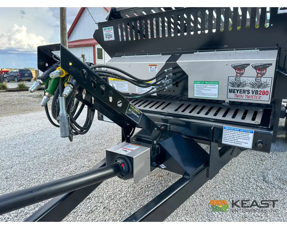 The Meyers VB280 is a vertical-beater spreader featuring a solid poly-lined box and BERMA gearbox with a 280 cu ft struck (approx. 470 cu ft heaped) capacity, designed for heavy loads with minimal maintenance and reliable drivetrain.